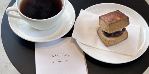 cosudocoに行ってきました。センターキッチン、手前と奥に本棚、一面がガラス窓で、一面はストーブと2階への階段があり...